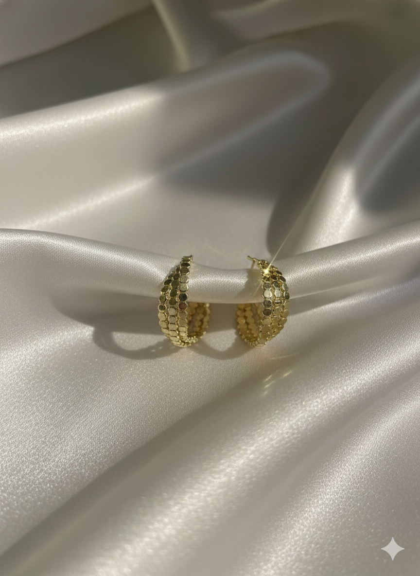 Gleaming with layered brilliance, these gold hoops feature a mesh-like texture that catches every flicker of light. Bold yet graceful, they’re crafted to elevate both festive ensembles and everyday elegance.