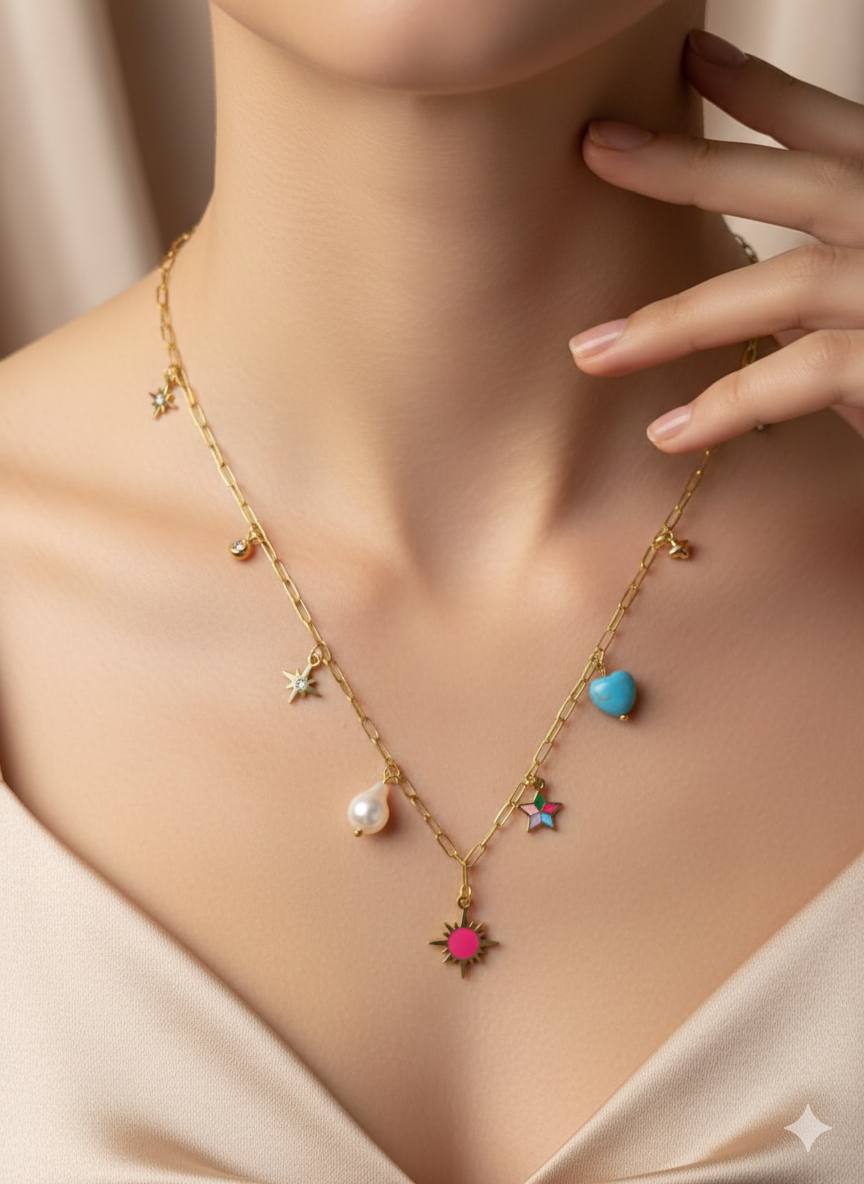 A joyful medley of color and form—this necklace features a playful mix of sunbursts, hearts, stars, pearls, and spheres, each charm radiating personality and sparkle. Suspended from an anti-tarnish chain, it’s a celebration of creativity and style, perfect for those who love to wear their mood.