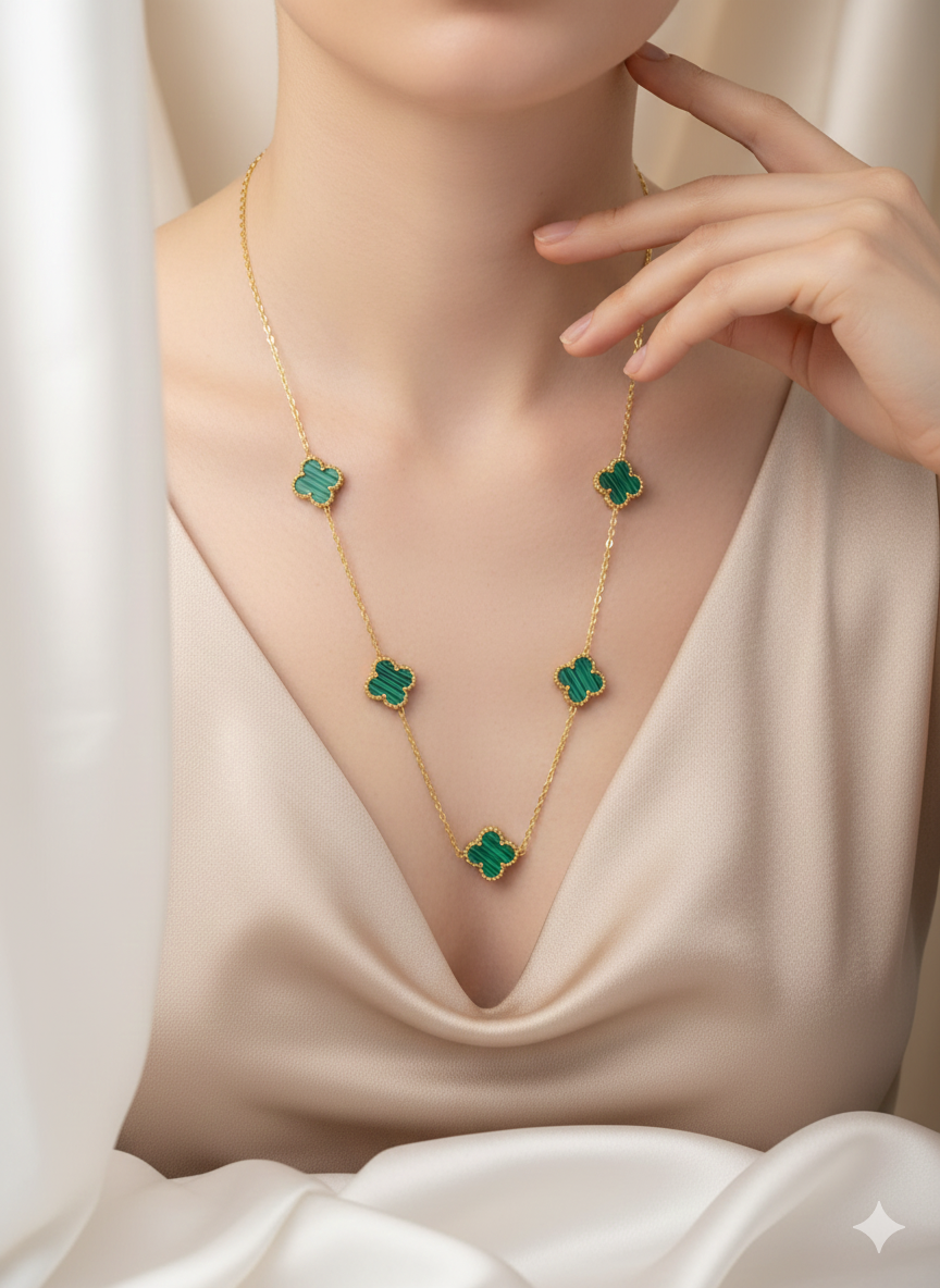 A symbol of luck and luxury, this necklace features six rich green clover motifs framed in radiant gold. Each charm adds a touch of nature’s grace, while the anti-tarnish chain ensures lasting brilliance—perfect for those who wear elegance with meaning.