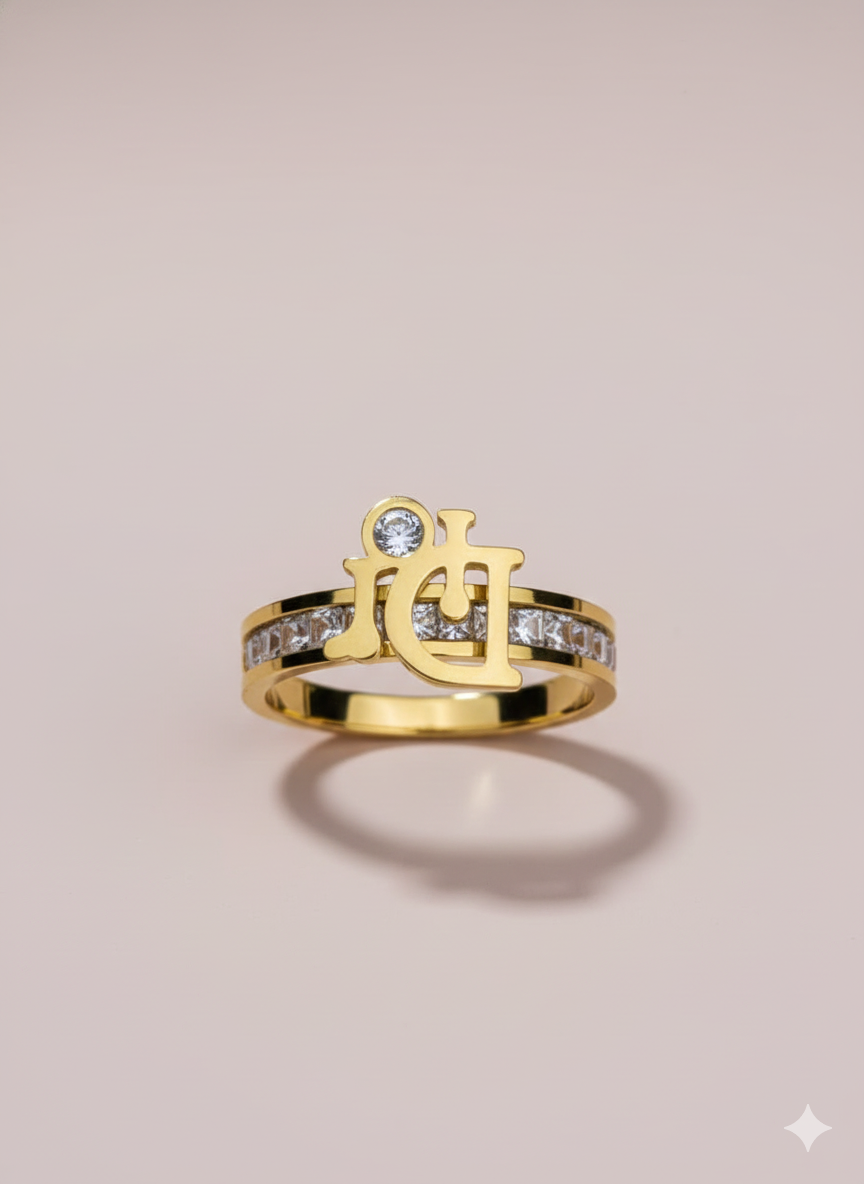A fusion of identity and opulence, the Emblazia Crest features a stylized central motif crowned with a brilliant round diamond, framed by a band of square-cut stones. A regal statement of individuality and elegance.