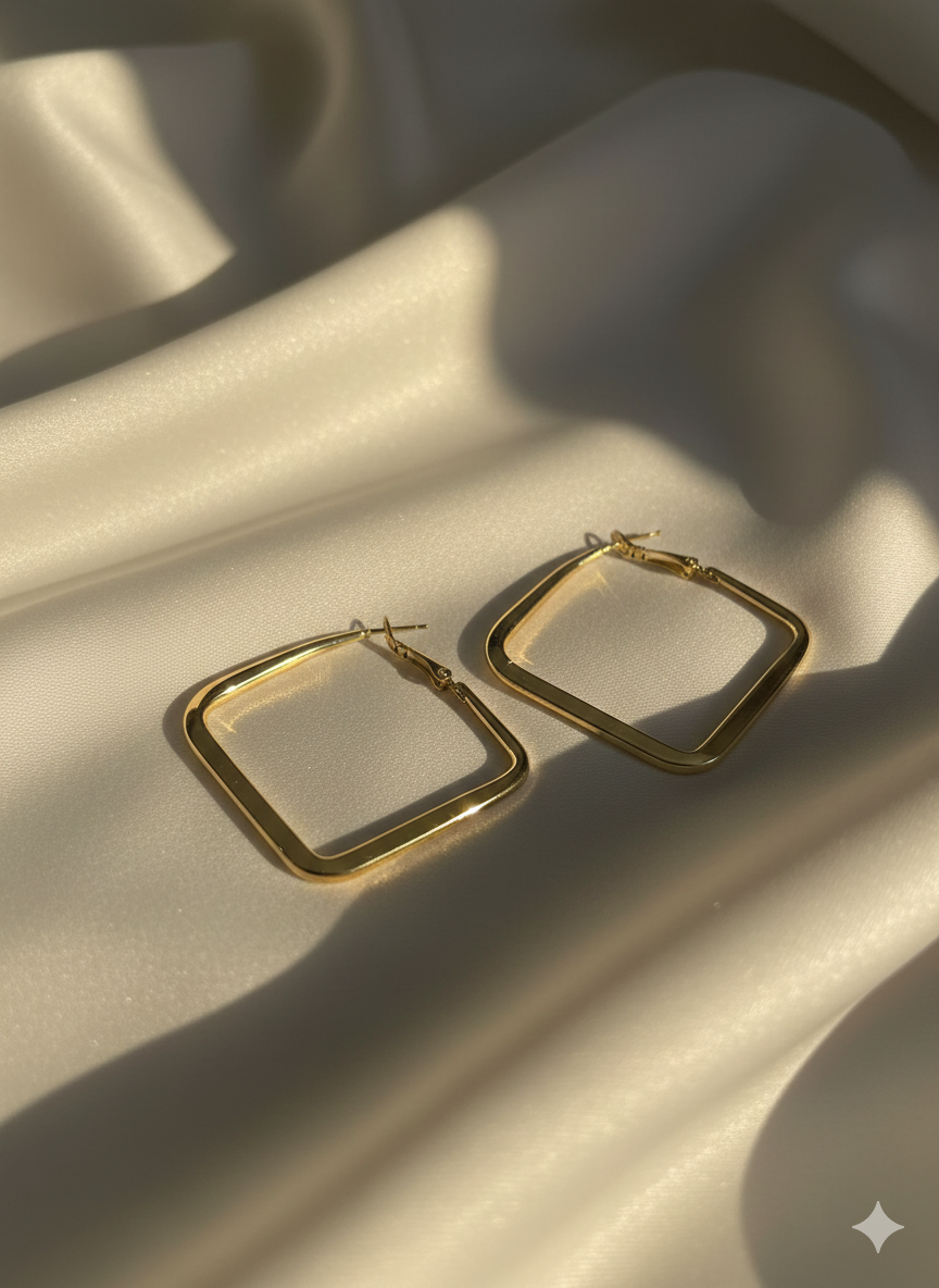 Minimalist yet magnetic, these square gold hoops sculpt elegance with clean lines and a polished gleam. A bold twist on classic hoops, they’re perfect for contemporary styling and everyday luxe.
