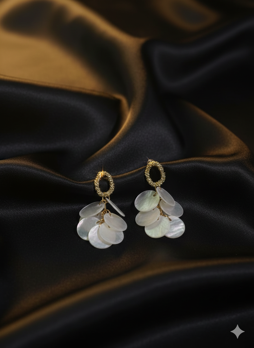 Textured gold loops release a waterfall of iridescent discs, echoing ocean shimmer and festive elegance. Light, fluid, and full of charm—perfect for catalog highlights and graceful celebrations.