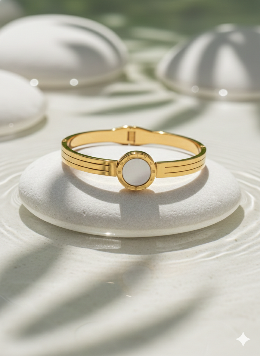 & Free ShippingA sleek gold bracelet with a luminous white centerpiece and etched lines, crafted to resist tarnish and radiate timeless sophistication.