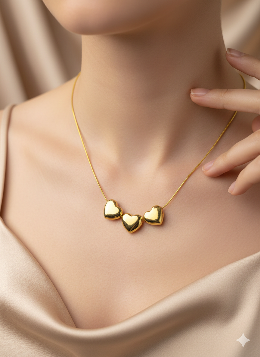 Three golden hearts, side by side, speak of love in harmony—this necklace is a graceful ode to connection and warmth. Crafted with an anti-tarnish chain, it stays luminous through every cherished moment, making it a timeless piece for everyday affection.