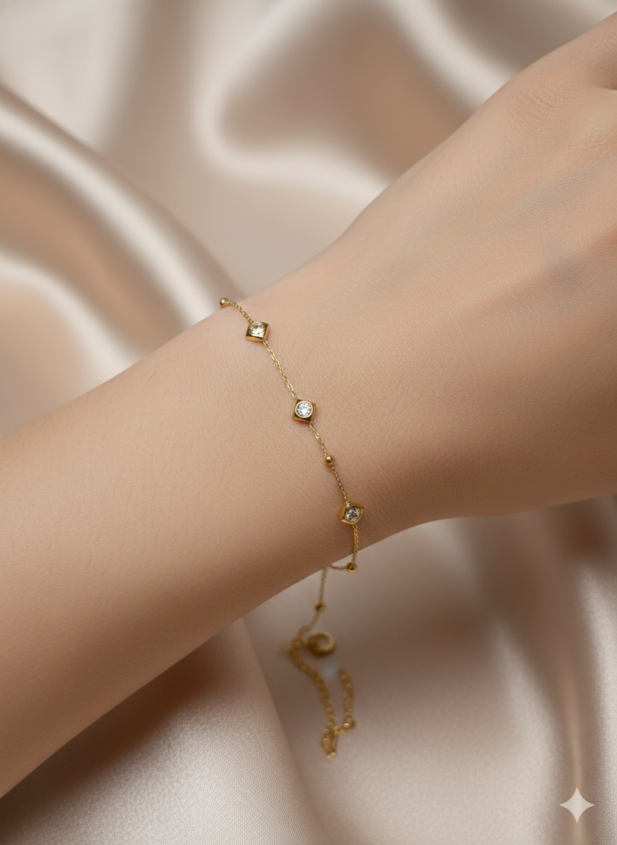 Delicate yet dazzling, Lunara Links features a fine gold chain adorned with evenly spaced geometric bezels, each cradling a brilliant gem. A whisper of elegance for wrists that speak in shimmer.