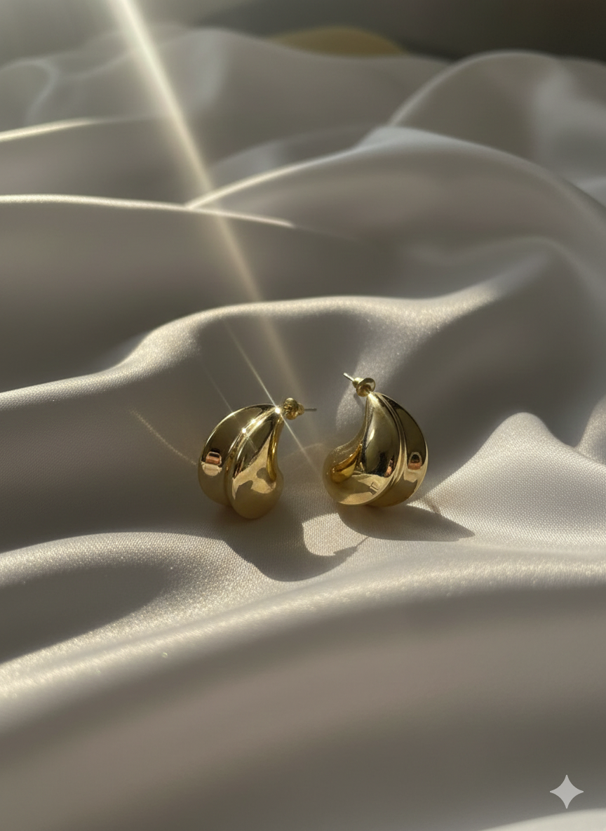 With fluid contours and a mirror-like gleam, these gold teardrop earrings embody modern elegance. Their sculptural silhouette catches the light with every turn—perfect for evening glamour or minimalist chic.