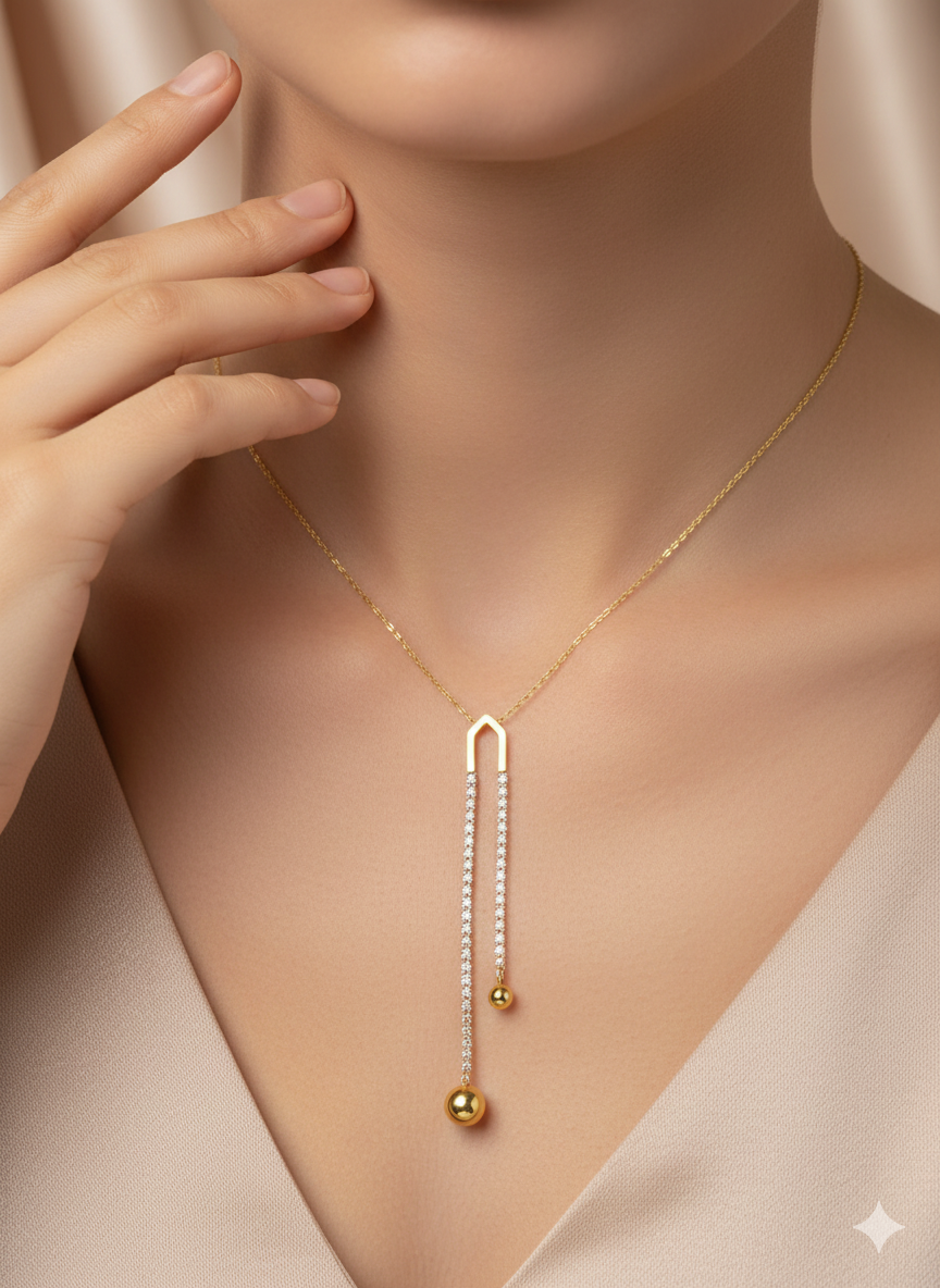 A study in balance and brilliance, this pendant features a graceful gold arch with twin gemstone strands ending in polished spheres. Its asymmetrical elegance and sparkling detail make it a standout piece, while the anti-tarnish chain ensures lasting radiance and refined charm
