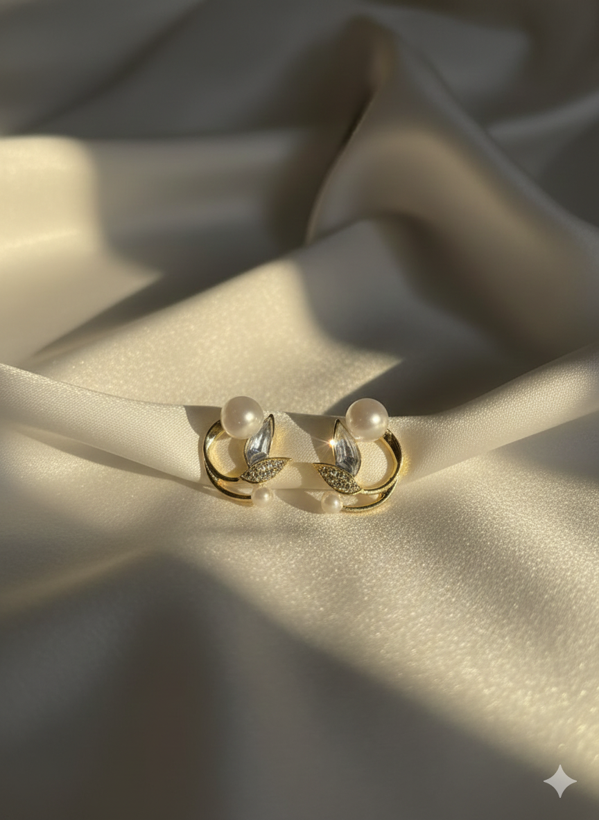 Twin pearls frame a golden arc adorned with a sparkling leaf and marquise-cut crystal. A poetic blend of elegance and organic charm—perfect for festive occasions and catalog highlights.