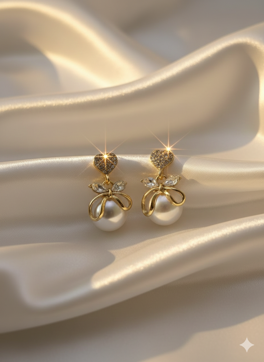 A romantic blend of sparkle and grace—these earrings feature heart-shaped studs, shimmering bow motifs, and luminous pearls that sway with every movement. Designed to evoke timeless charm and modern elegance.
