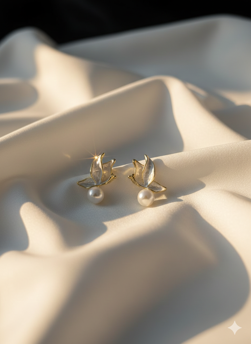 Inspired by golden foliage and morning dew, these earrings pair shimmering leaf motifs with luminous pearls. A poetic blend of elegance and earthiness—perfect for serene celebrations and everyday charm.
