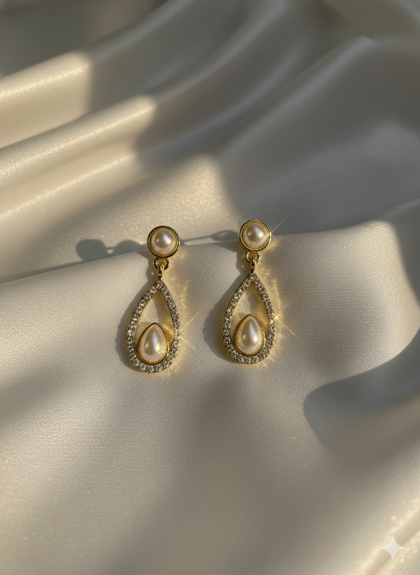 A luminous pearl nestles within a golden teardrop halo, sparkling with delicate stones and timeless charm. These earrings blend royal grace with bridal beauty—perfect for weddings, festive soirées, or heirloom gifting.