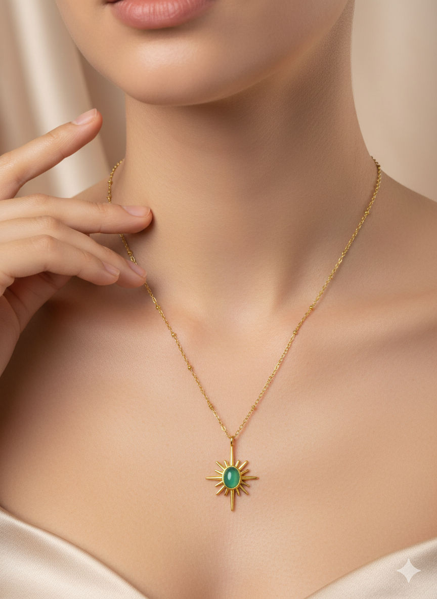 A burst of golden rays surrounds a lush green gemstone, echoing the vitality of sun and earth. This sunburst pendant, accented with delicate detailing, hangs from an anti-tarnish chain—bringing brilliance and botanical charm to every look.