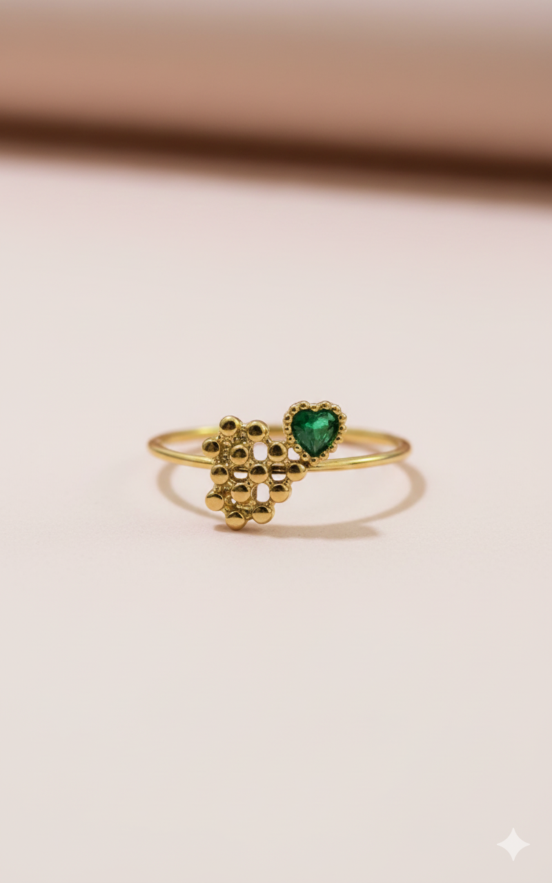 A fusion of whimsy and elegance, the Verdelle Charm pairs a radiant green heart-cut gem with golden bead geometry—an enchanting ring that speaks of nature’s grace and modern artistry.
