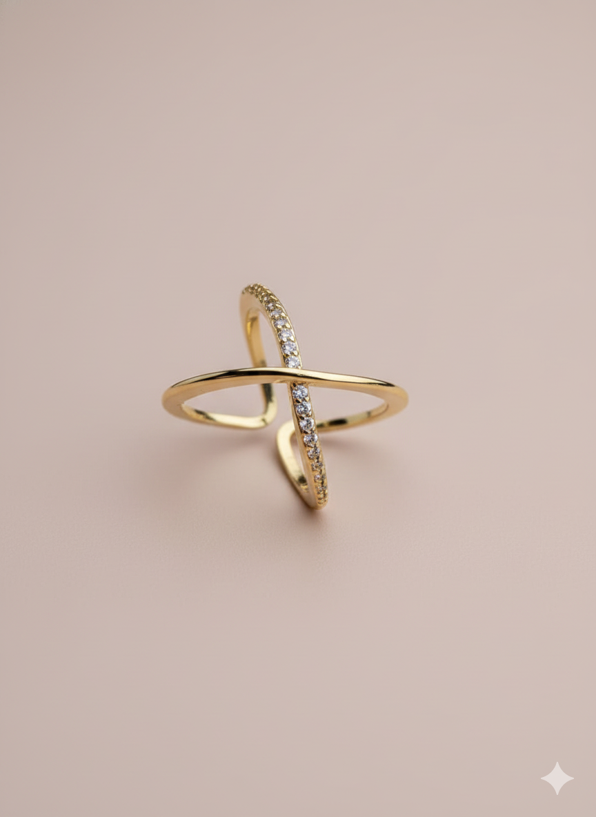 Where elegance meets edge—Xyla Radiance features a bold X-shaped silhouette, with one band aglow in pavé-set brilliance and the other in polished gold. A modern icon for those who shine with quiet confidence
